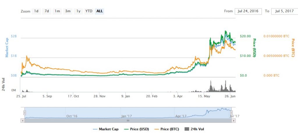 В данный момент эта криптовалюта занимает пятое место в общекомандном зачет с капитализацией составляющей 1,634,327,236 у.е. (5 июля 2017 года)