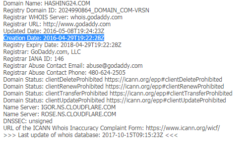 Начнем с самого интересного — в соответствии с сервисом whois.net доменное имя hashing24.com было зарегистрировано 2016-04-29 в 19:22: