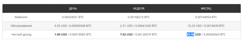 Так минимальная цена инвестиции составляет 0.006438 BTC, что составляет 35.7 $ и является не самой высокой ценой среди облачного майнинга.