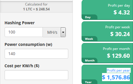 Давайте для наглядности возьмем 100 Mh/s, стоить они будут 750$ (общая цена) + 1.82$ обслуживание. Итого 751.82 доллара будет стоить годовой контракт Scrypt у Hashflare.
