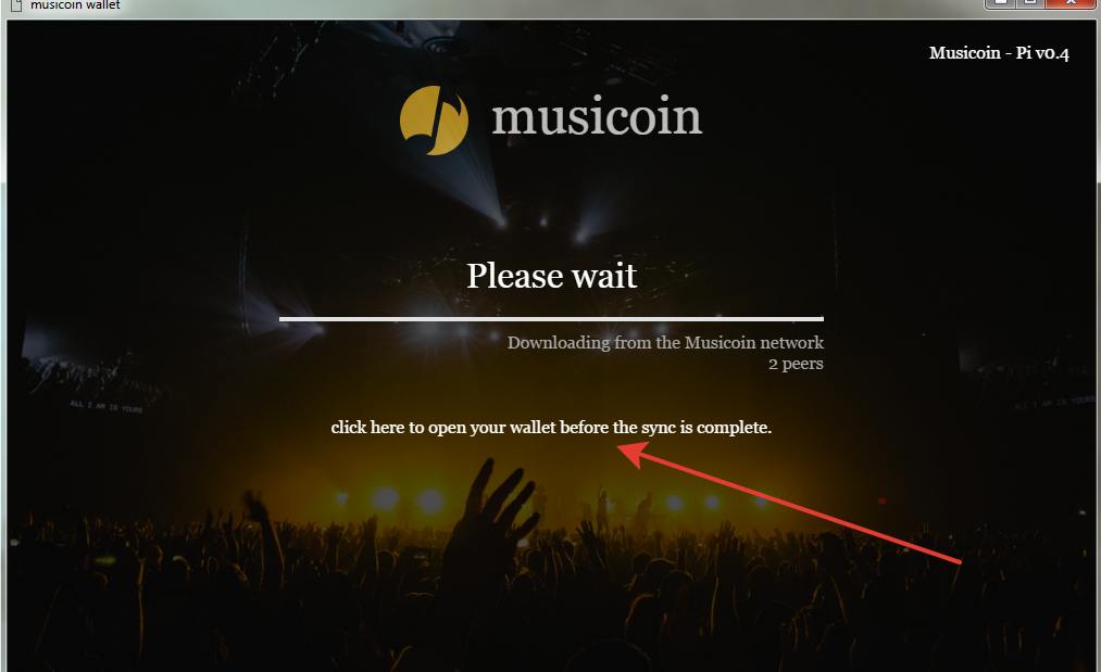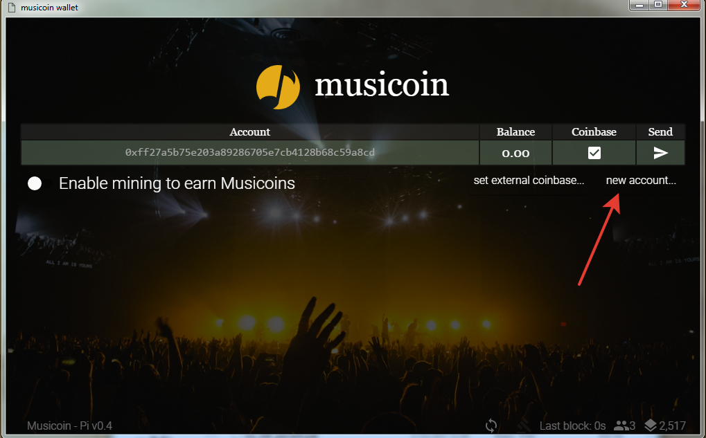 А теперь открываем Musicoin-client.exe, пропускаем синхронизацию и переходим сразу к созданию кошелька нажав на надпись new account.