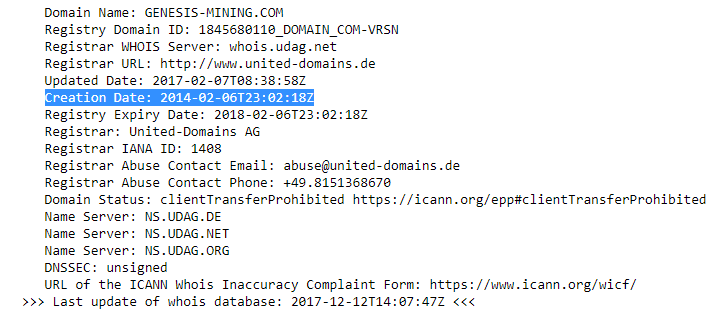 Платформа существует на нескольких региональных и международных доменах, согласно whois, сайт genesis-mining.com был зарегистрирован еще в июне 2014 года, это в свою очередь означает, что ребята на рынке давно, а не сделали компанию на волне хайпа.