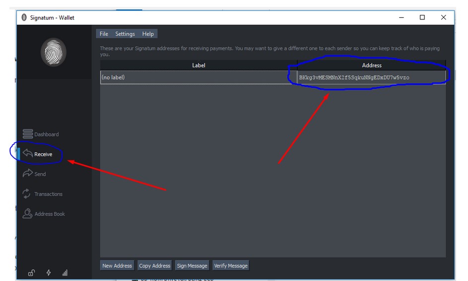 После установки переходим на вкладку receive, после чего мы и увидим свой адрес кошелька.