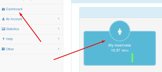 Проверим на пуле, для этого зайдем во вкладку, в боковом меню «Dashbord» и найдем виджет «My Hasrate», подождите минут десять, максимум полчаса и там должны появится данные с хешрейтом: