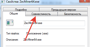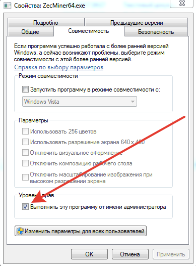 Если бьет ошибки, не удивляйтесь такое тоже бывает, тогда находим файл ZecMiner64.exe и открываем его «Свойства» правой кнопкой мыши и нажимаем на «Совместимость», где ставим галку над «выполнить от имени администратора», (не забываем нажать применить!). Теперь должно корректно заработать.