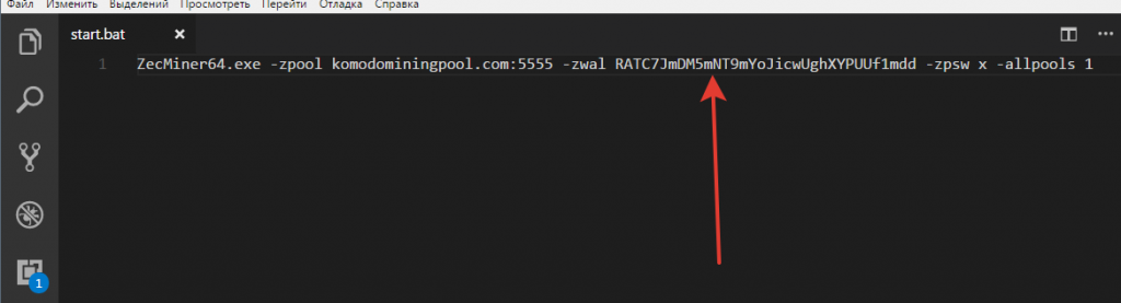 Теперь нам необходимо вставить свой номер кошелька, в данном случае указан мой кошелек — RATC7JmDM5mNT9mYoJicwUghXYPUUf1mdd. Вам же необходимо заменить на свой. Есть два варианта первый — создать локальный кошелек и хранить намайненное на собственном компьютере, а второй создать его на бирже.