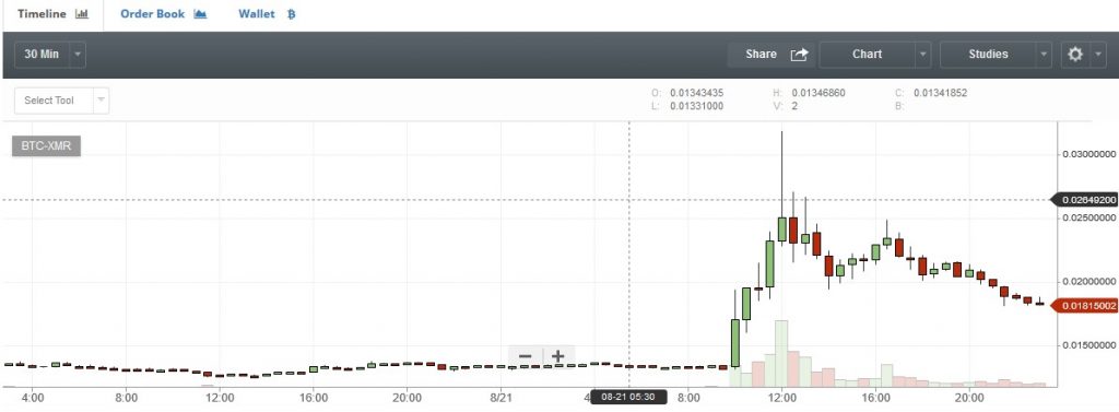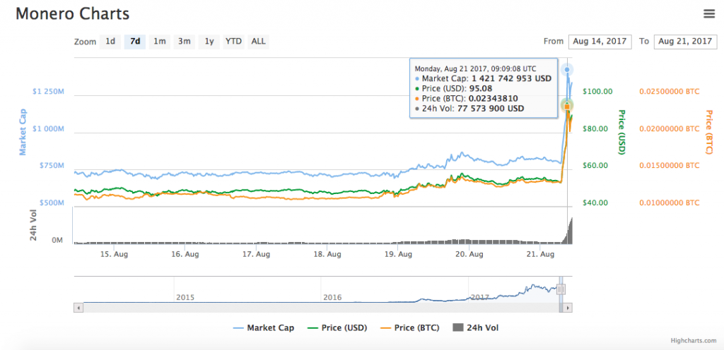 Ранее не особо популярная но стабильная валюта Monero, торговалась примерно на уровне 30-40 долларов, а 21 августа взлетала чуть ли не до ста за штуку. Правда теперь немного упала, но все равно цена осталась выше чем была на 38.54%.