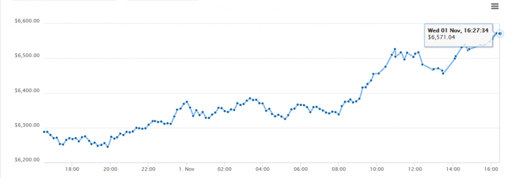 Сейчас же биткоин продолжает ломать психологические границы в головах инвесторов и бьет очередные исторические максимумы. Вот почасовой график начиная с 31 октября по 1 ноября: